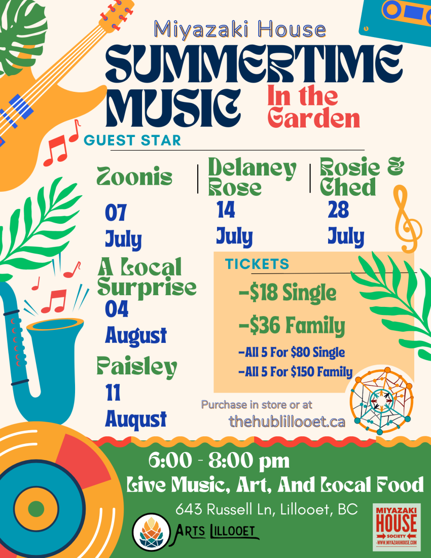 Summer music concerts have been a popular event at the Miyazaki House for many years. We are excited to partner with Arts Lillooet and the HUB to bring music back to the heritage house. These are family friendly events and fun art activities are offered for children while their families enjoy the music! Concerts are…